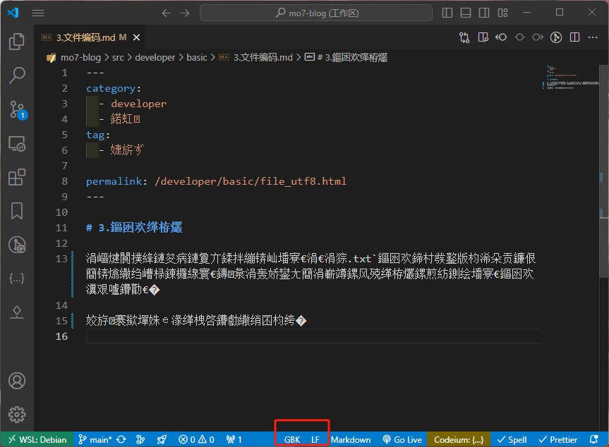 比如当前正在编写的这篇文章,如果采用 GBK 编码打开,就会变成一堆不认识的字符: